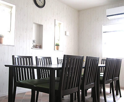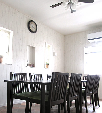 木目調の白い壁の空間には大きなテーブルと椅子が揃っています。天井にはお洒落なシーリングファンとやわらかな光が、部屋の雰囲気を一層引き立たせています。会議や打ち合わせはもちろんの事、個々のカルチャースクール、または有名菓子店のカタログや雑誌の撮影などもこの場所で行われています。